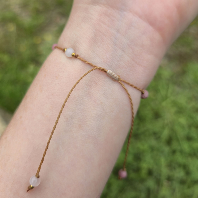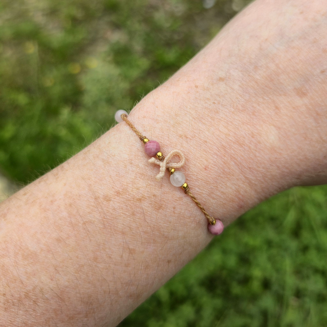 Portez un symbole de force et de féminité avec ce bracelet tissé en macramé, délicatement composé de Quartz Rose et de Rhodonite.